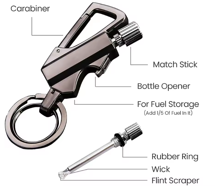 Den här påfyllningsbara tändaren kombinerar nyckelring, flasköppnare och tändfunktion Den är byggd för att tåla väder, vind och äventyr. Precis när du trodde att du var fast — klickar du igång flammans styrka, fyller på bränslet och är redo. Med denna gadget har du tryggheten, funktionsverktyget och stilen i ett enda paket.